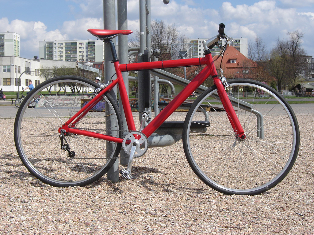 Na zdjęciu rowerek z opisywaną alu ramą Kildemos w przeróbce singlespeed ale niestety już z inną korbą.