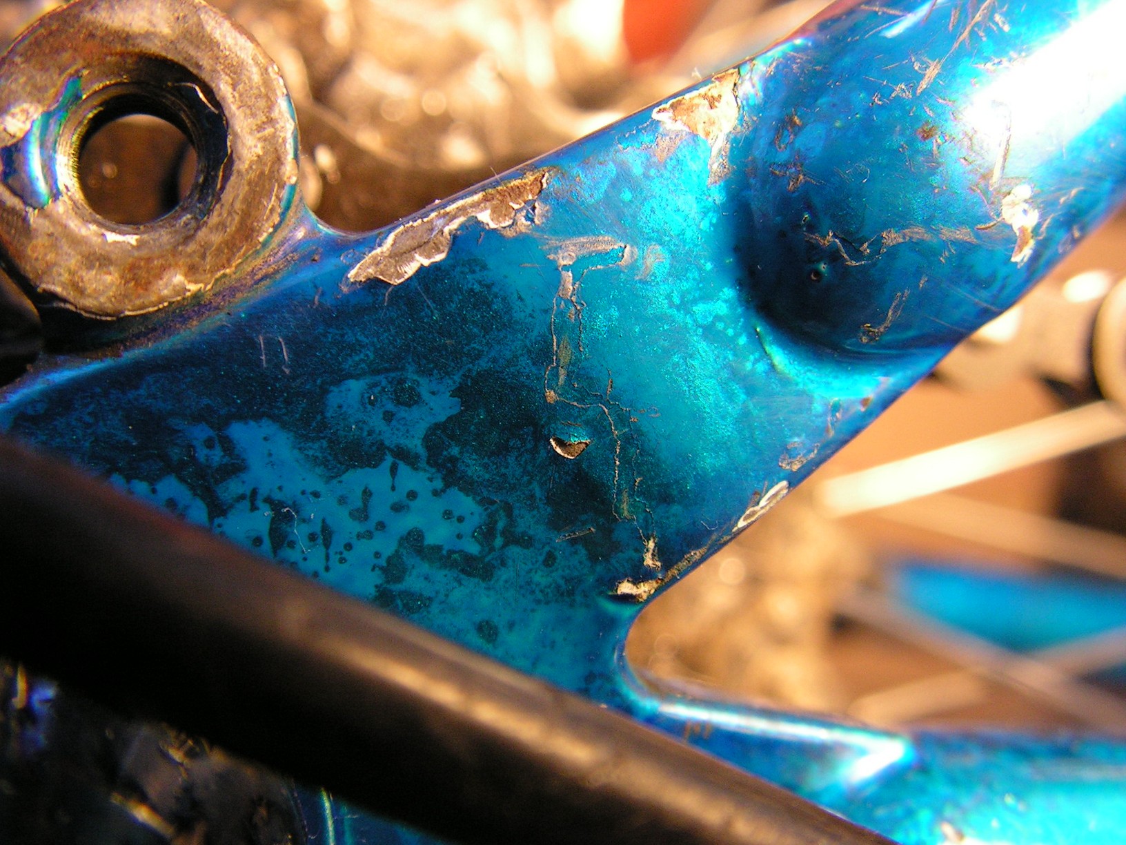 spękanie lakieru przypisałbym pracy materiału i ew dostaniu sie gdzieś pod lakier wilgoci (np jeden z roczników Scotta miał jakiś feralny lakier, który w wyniku pracy materiału pękał na spawach, szczególnie przy główce Jak ktoś o tym nie wiedział to można było najeść sie strachu, a i ci co wiedzieli zdrapywali lakier dla pewności Ramy z tego rocznika i modelu jednak pękniętej nie widziałem, choć wyglądało to dużo bardziej drastycznie niż u Ciebie)