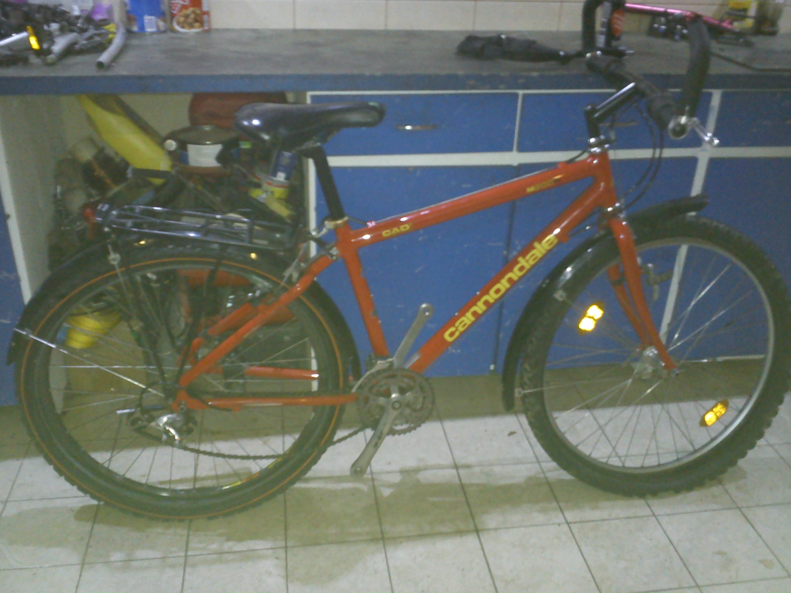 Nabyłem ostatnio takiego Cannondale, w celu odsprzedania go dalej, ale zaproponowałem mojej dziewczynie złożenia dla niej retro rowerka, i odźiwo się zgodziła :), i to był impuls żeby go zostawić. W sumie dużo nie kosztował. Jest to Cannondale M200 SE Cad1, z roku 1996 jak się nie mylę. Lakier w całkiem fajnym stanie, wszystkie stare części zdjąłem i nałożyłem szpeje które leżały odłożone specjalnie na jakąś fajną ramę. Trafił kompletny osprzęt Deore XT, po za korbą Deore DX, obręcze Ambrosio w ciekawym szarym odcieniu, wszystko wygląda prawie jak nowe, śladów zużycia prawie brak.