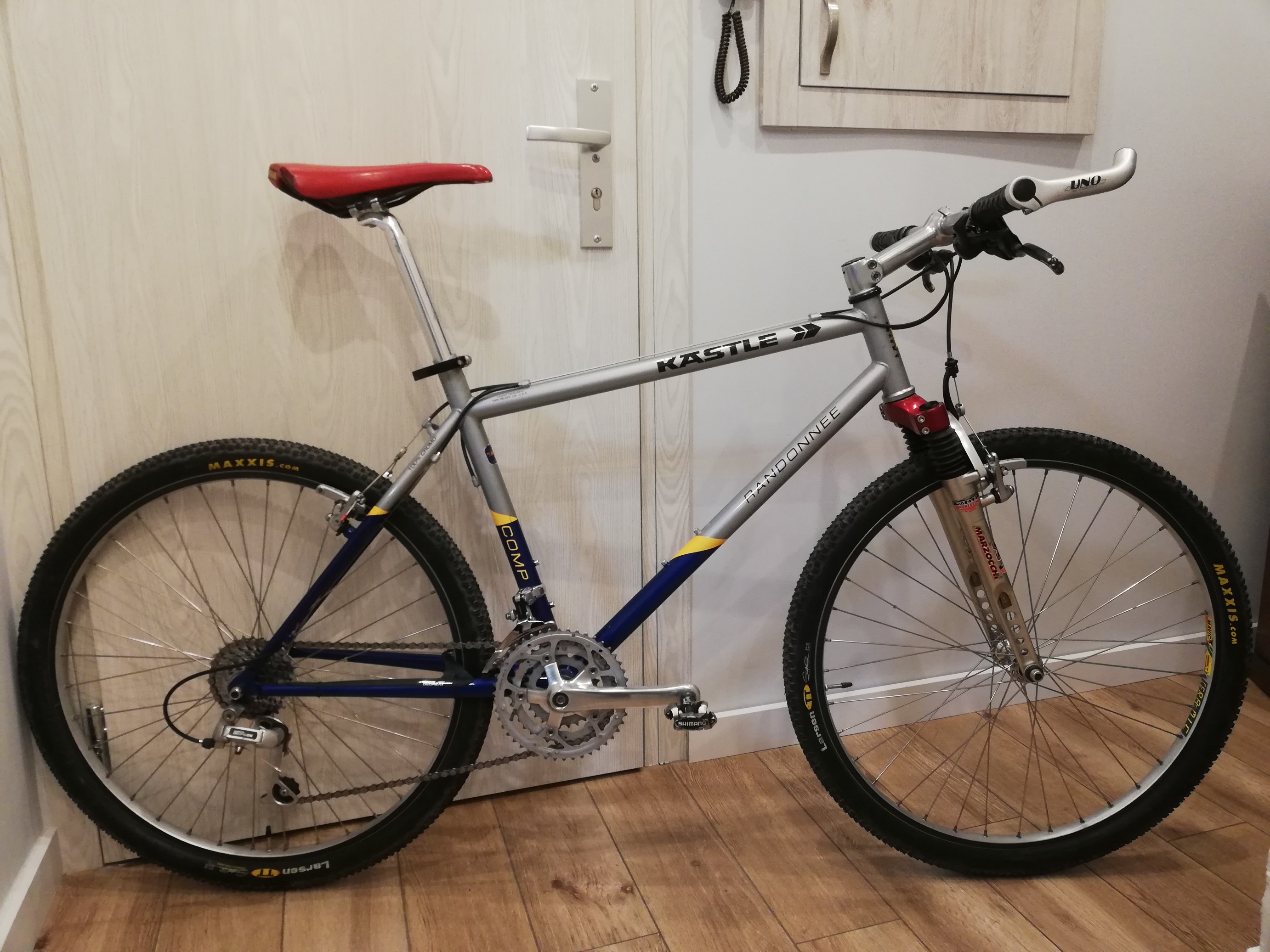 #1Kolejny szybki projekt. Rower powstaje z niczego) Rama leżała długo w piwnicy ,gratów się nazbierało w międzyczasie) Klimat początku lat 90tych będzie tu obowiązywał. Rama w pięknym stanie. Wygląda jak leżak magazynowy. Osprzęt montuje DX. Fajne koła na ciekawych obręczach Wolber Totanium Light. Założyłem nowe cieniowane szprychy. Stery ,kiera ,sztyca Ritchey....Rama niska ale długa na 56 cm. Z mostkiem 130 będzie na mnie pasował.