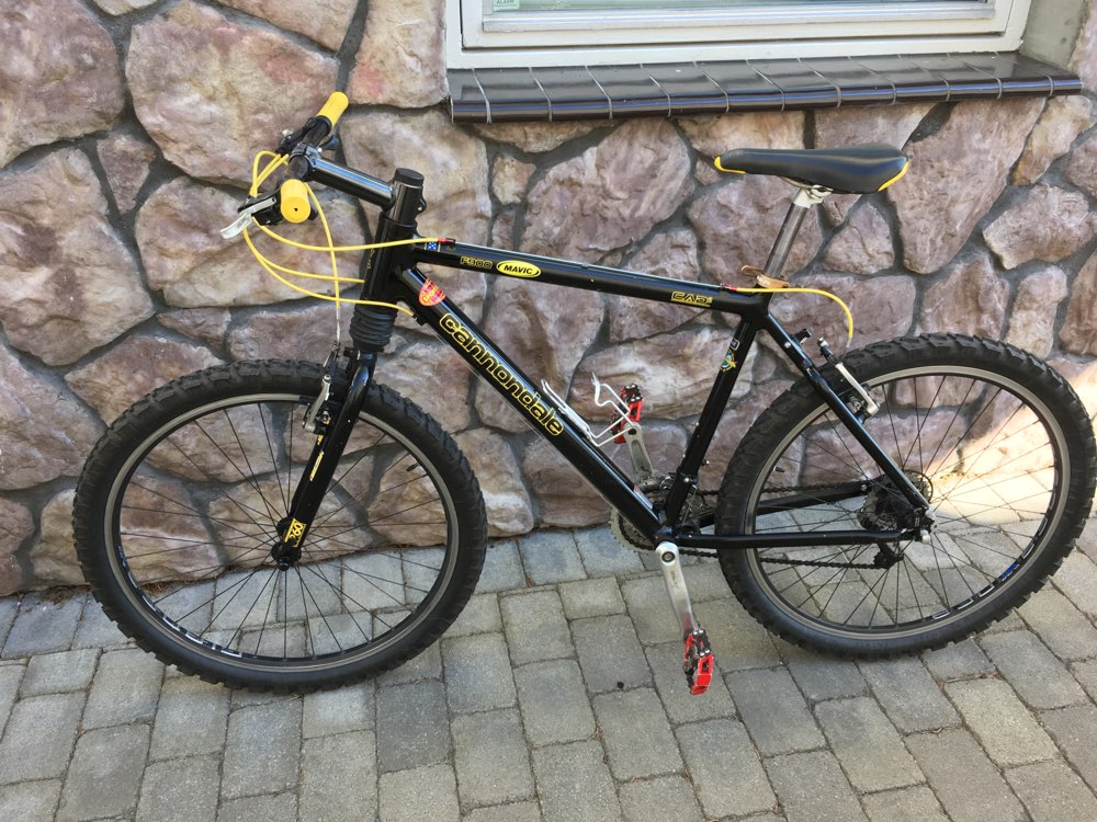 Ponieważ lubię rzeczy nietypowe, więc skusiłem się na zakup trochę zaniedbanego Cannondale F900 z bliżej nie ustalonego rocznika 96-98 (nie bardzo mogę odczytać napisy na ramie). Czarny z żółtymi napisany, parę lat temu ktoś tutaj chwalił się podobnym (F800), na ramie CAAD2. Konfiguracja nie jest 'jak z katalogu', ciężko stwierdzić czy już przy zakupie był dozbrajany, czy też przechodził późniejsze modyfikacje. Osprzęt w większości jest Deore XT, seria M739 (v-brake z równoległym prowadzeniem klocków), więc rocznikowo zgodna z ramą - jest więc możliwe że był tak skonfigurowany od początku. Koła Ritchey PRO (Giroer OCR? - niespecjalnie mogę znaleźć jakieś dodatkowe informacje) ,ale dostałem również oryginalne obręcze Mavic'a z piastami Coda i zajechanymi łożyskami. Przydadzą się jako drugi komplet. Całość uzupełniają pedały Shimano DX M636, platformy z systemem SPD.