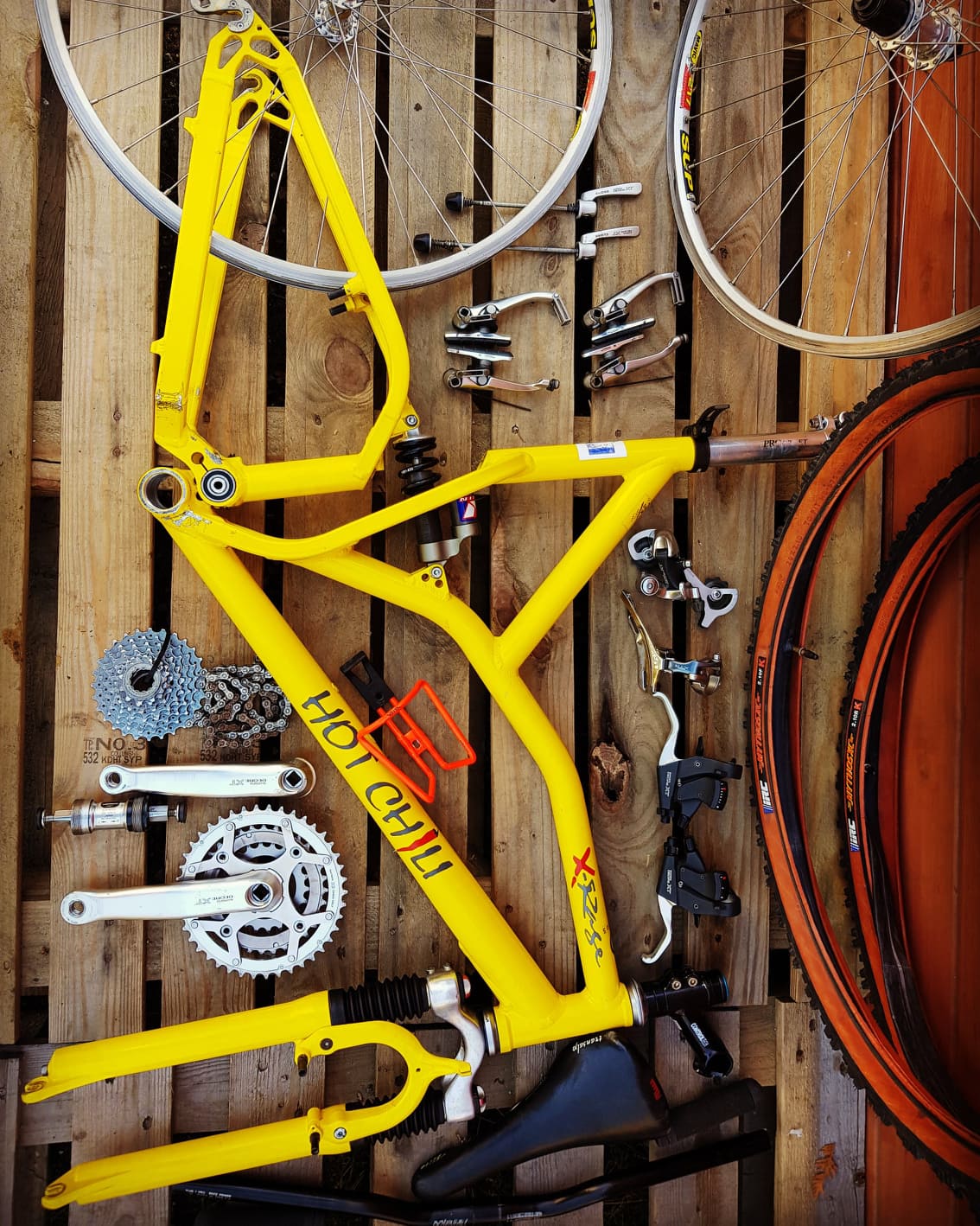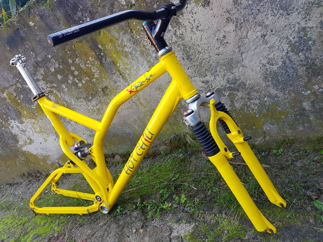 Trafił mi się Hot Chili X-Rage, nie wiem z którego roku, 1993-94? Lubię te cudaczne stare fulle. Mam już plan, jak będzie złożony, na pewno napęd 3x8, amortyzator Rock Shox Judy SL.