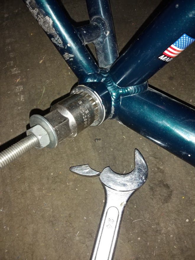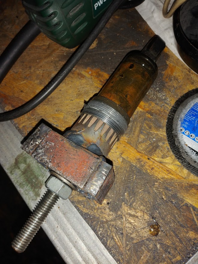 Największy problem sprawił suport... Zapieczony na amen. W ramie było też wkręcone lewe ramię Lx i miało zerwany gwint. Ściągacz z gwintem stożkowym dał radę bez problemu, ciężko było ucelować żeby się prosto wkręcił ale dałem radę. Tak zapieczonego suportu jak w tej ramie nie miałem nigdy. Złamałem klucz 24 z przedłużką jakieś 120 cm. Odwróciłem na oczkowy i coś puściło ale to dosłownie pykło i nic... Stawałem nogą na przedłużce i coś tam drgnęło. No to co klucz do imadła i próbowałem kręcić całą ramą.... Klucz objechał w imadle kilka razy. Cóż robić ?? nic tylko dospawałem 4 kawałki blachy w pracy żeby była większa powierzchnia trzymania ... Stosuję i idzie ale topornie ale widzę że moje imadło coś zwiotczało... yyyy no se pękło !! sprawdzam i nie dowierzam