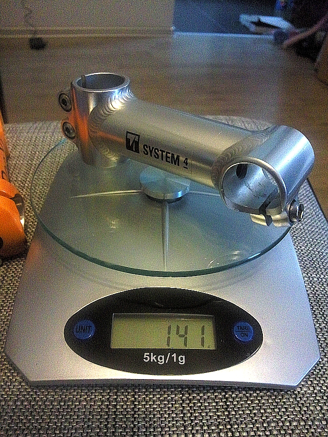 Mostek NOS, kierownica trochę zmęczona i przycięta, ale tania była więc nie będę narzekał... Zysk wagowy w porównaniu do poprzednich rurek to ok 130g licząc w pamięci na szybko, więc fajnie.