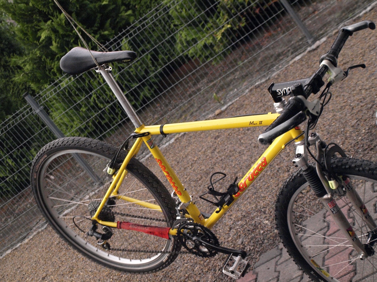Plany... Trzeba zrobić jakieś zaprawki na ramie, ogólnie źle nie jest, nawet bez większego czyszczenia. Widelec - 1cal, trochę problematyczny, ale działa. Tylko że stan lag jest opłakany. Chodzi mi po głowie malnąć go pod kolor napisów na ramie, taki ni czerwony, ni różowy. Raczej zostanie. Dałbym tu Manitou III, ale sterówka nie ta - wtedy byłby żólto-niebieski.