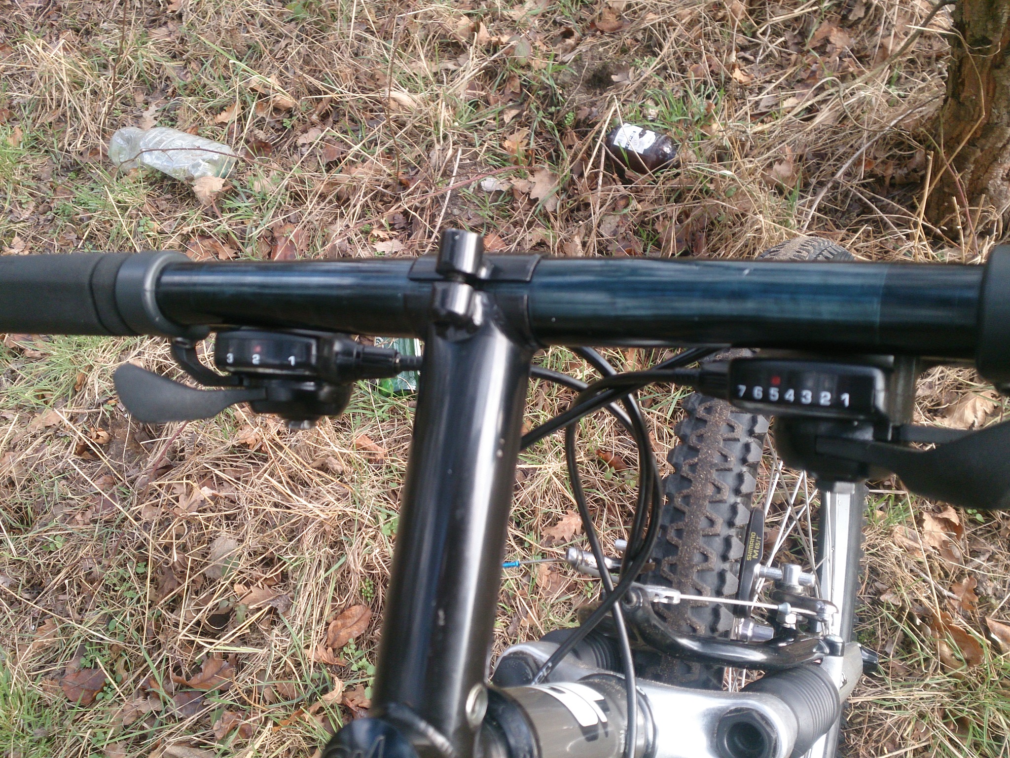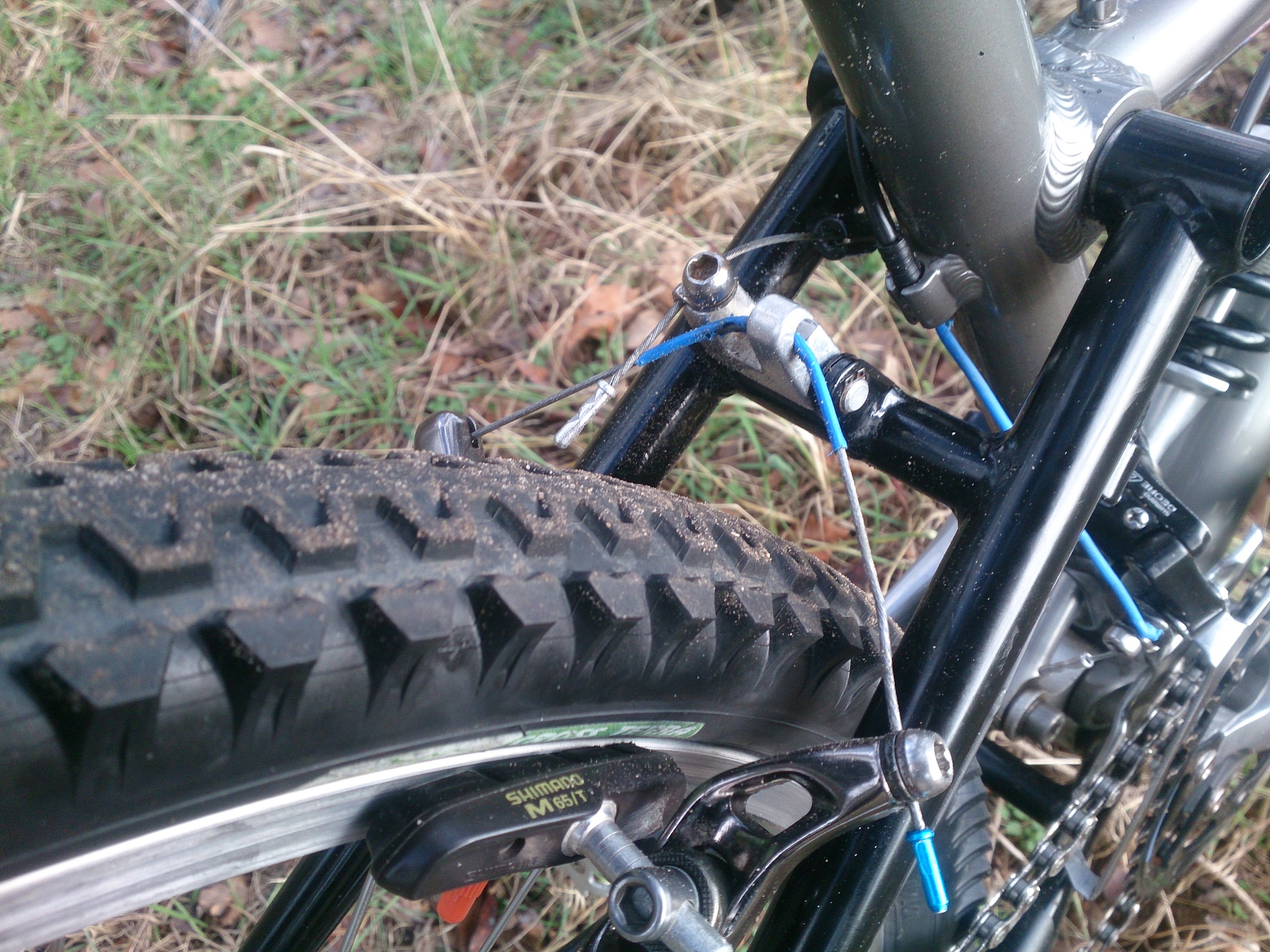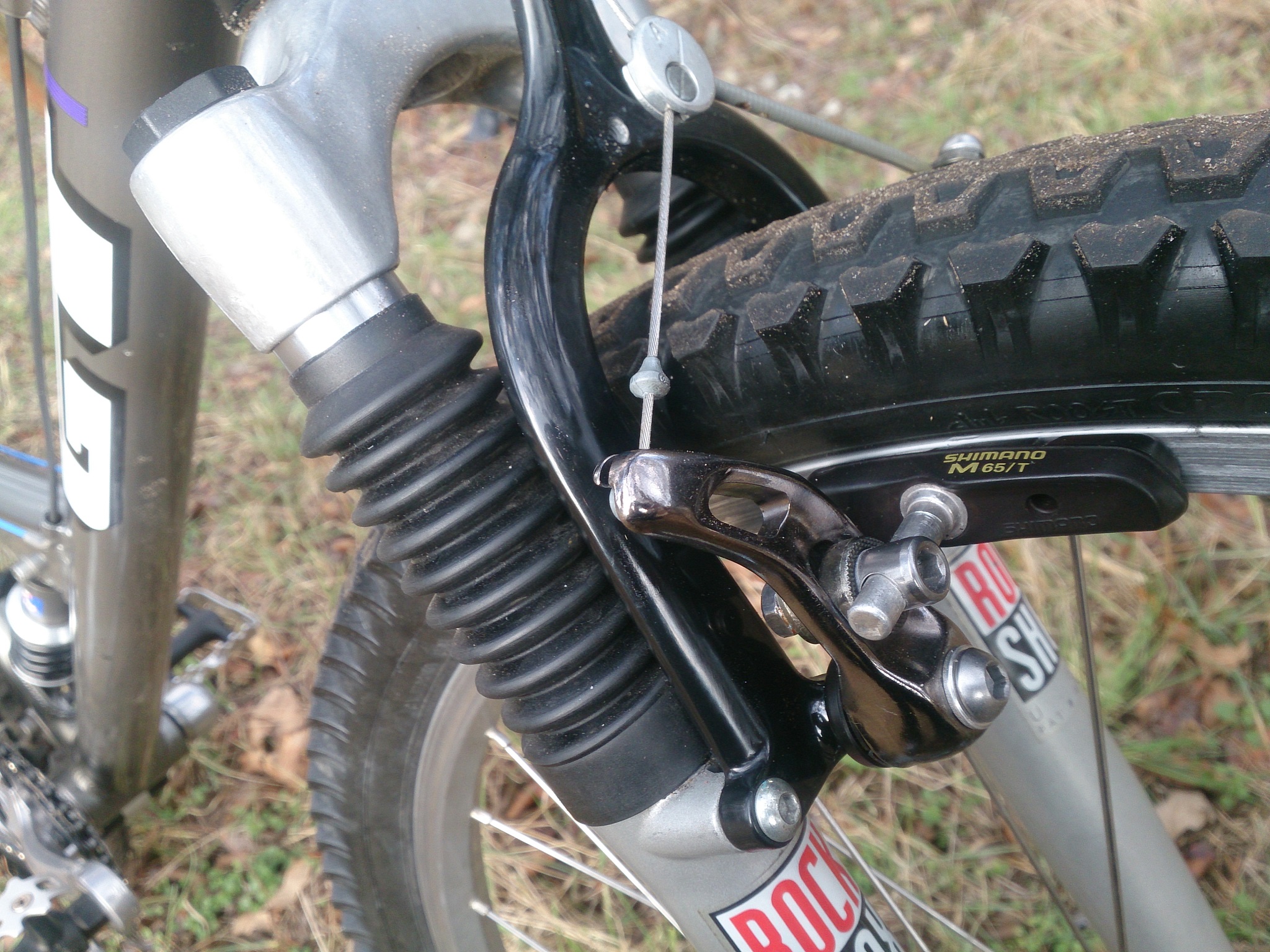 skolioza, Ciezko bylo ustawic odpowiednio tylne hamulce. Po pierwsze musialem rozebrac ta "dzwignie" wyczyscic i przesmarowac. Musi byc ona ustawiona odpowiednio blisko od wyjscia linki z pancerza. Wiekszy kat wygina mocno linke i calosc robi sie miekka. Uzyskalem jakis kompromis bo przy mocnym rozchyleniu ramion hamulca hacze butami o ramiona przy ramie...