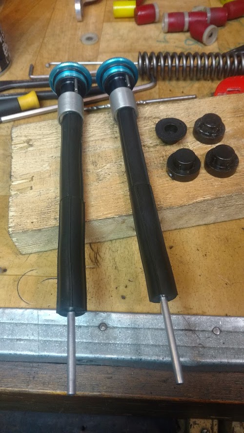 szaszłyk w dobrej kondycji ,elastomery nie są popękane, jedynie ubiły się może z 1 cm. Myślałem co tu zrobić żeby amortyzator chciał pracować. Wpadłem na pomysł wsadzenia sprężyn z SR suntour. Znalazłem odpowiedni rozmiar,kątówką obciąłem na porządany wymiar . A żeby za bardzo amortyzator nie nurkował dałem do środka elastomery. Problem polegał na tym, że pokrętło regulacji twardości ma trzpień, więc elastomer musiałem przewiercić na całej długości . No przyznam łatwo nie było ze względu że był długi i miękki.Sprężyny zakończyłem zaślepkami z tworzywa żeby nie niszczyły wnętrza amora.