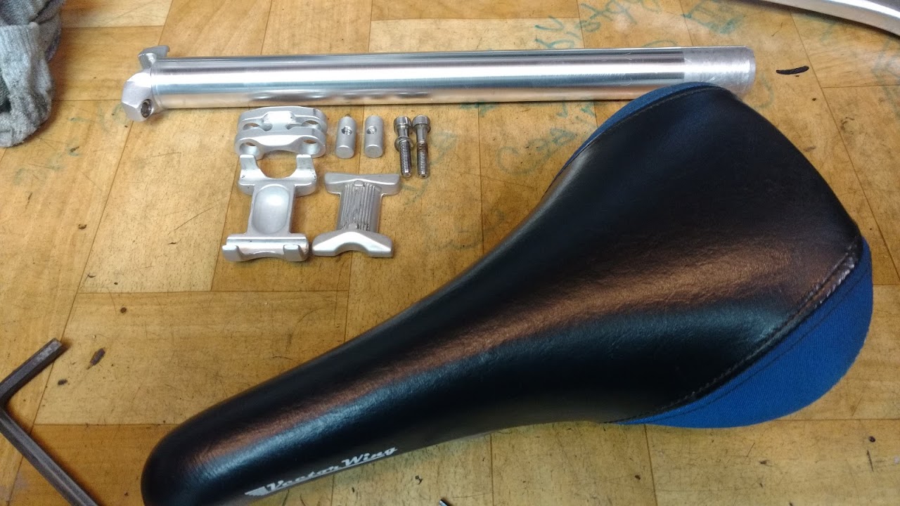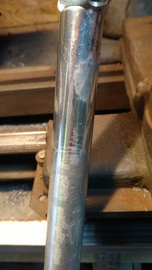 Kolejnym elementem który wziąłem na warsztat była sztyca.Ktoś wcześniej się z nią mordował i mocno porysował.Okazało się że jeden z elementów (nie wiem jak to nazwać..skrzydełka??)przy zacisku był wgięty do środka i powodował rysowanie sztycy.Z pomocą pilnika już to nie następuje.Nie pozostało nic innego jak włożyć sztycę do tokarki i spolerować ;-)