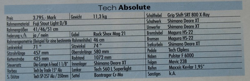W wakacje minionego roku moja kolekcja wzbogaciła się o dość rzadki okaz kanadyjskej manufakturki-Tech By Trade Absolute. Wg katalogu niemieckiego Bike'a z roku 1996 był to najwyższy model tej marki. Oparty na rurkach cr-mo Fuji Stout Lite stawia go na równi np. z Sunn'em Revoltem tamtych lat. Generalnie jeżeli chodzi o rurki to raczej topowy zestaw. Z tego co mi wiadomo cieniowanie 0.8/0.5/0.8 no i fenomenalna waga rozmiaru 20" - 1931g! Niełatwo było znaleźć coś z jeszcze wyższej półki. Moje niegdysiejsze Tange Ultimate Superlight MTB osiągało w kwestii wagi gorszy wynik o ok. 50g.