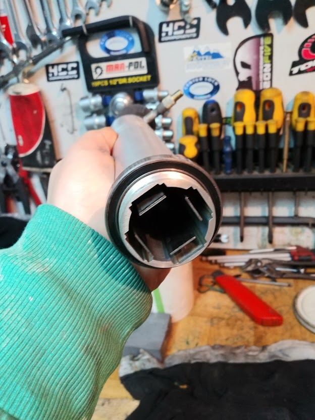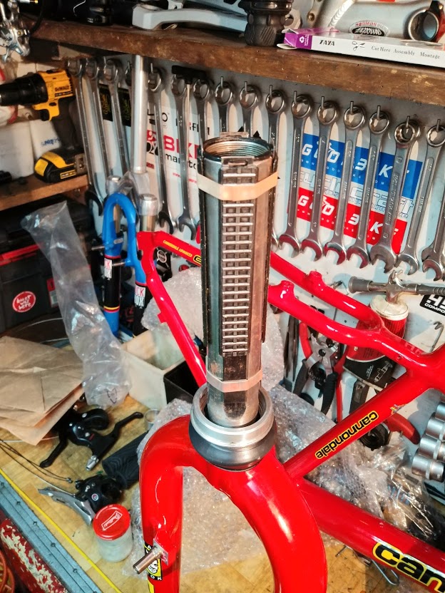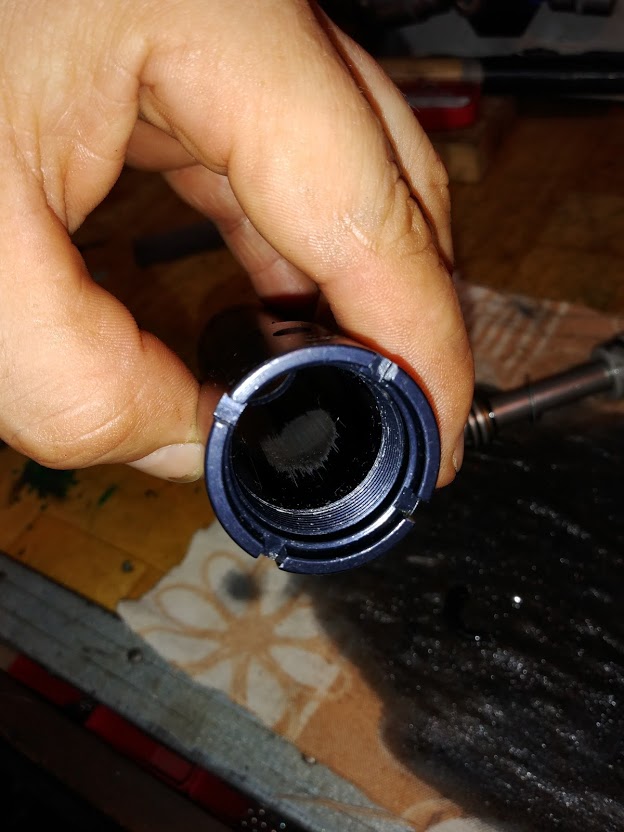 4 wgniecenia na dolnej rurze dość spore,przy suporcie jak by ktoś specjalnie łańcuchem po ramie jeździł i zrobił się dość głęboki rowek,dolna rura tylnego trójkąta, od strony łańcucha bardzo poobijana do gołego aluminium.Sporo rys i obtarć. Stery... jedno łożysko do wyrzucenia górne. Guma amora do wyrzucenia. Miałem problem z wybiciem headshoka ze starów zapieczone jak cholera. Pomógł dopiero młotek gumowy do kostki brukowej.Rozebrałem amor,bieżnie z dość sporymi wżerami rdzy,same wałeczki w tym koszyczku z tworzywa ok.Rozebrałem tłumik i już wiedziałem że ktoś przy nim kombinował, górny korek krzywo wkręcony,olej czarny,uszczelki do wymiany,cylinder porysowany i jakieś opiłki metalu były w środku, blokada nie działa.