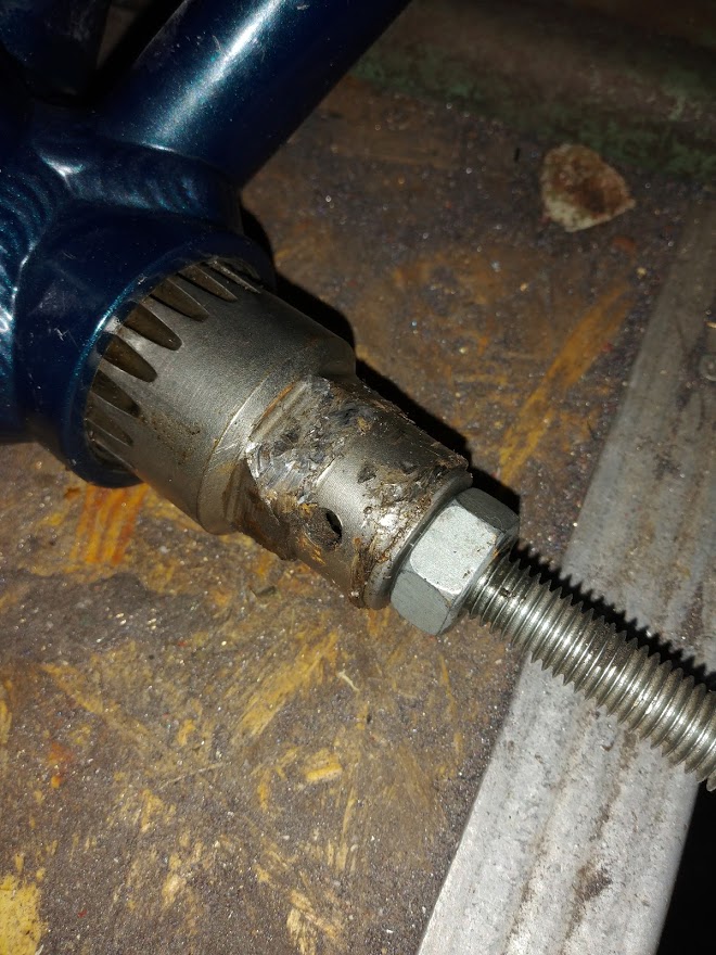 Największy problem sprawił suport... Zapieczony na amen. W ramie było też wkręcone lewe ramię Lx i miało zerwany gwint. Ściągacz z gwintem stożkowym dał radę bez problemu, ciężko było ucelować żeby się prosto wkręcił ale dałem radę. Tak zapieczonego suportu jak w tej ramie nie miałem nigdy. Złamałem klucz 24 z przedłużką jakieś 120 cm. Odwróciłem na oczkowy i coś puściło ale to dosłownie pykło i nic... Stawałem nogą na przedłużce i coś tam drgnęło. No to co klucz do imadła i próbowałem kręcić całą ramą.... Klucz objechał w imadle kilka razy. Cóż robić ?? nic tylko dospawałem 4 kawałki blachy w pracy żeby była większa powierzchnia trzymania ... Stosuję i idzie ale topornie ale widzę że moje imadło coś zwiotczało... yyyy no se pękło !! sprawdzam i nie dowierzam