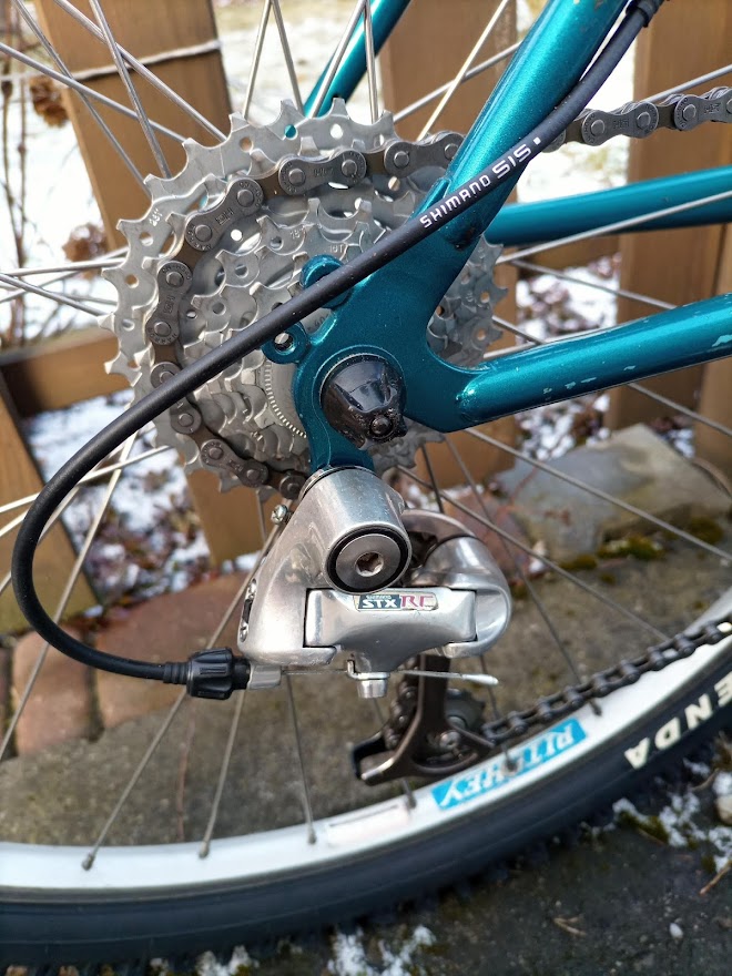 Projekt uważam za skończony. Wymieniłem obręcz z tyłu na mavic, dokupiłem pedały spd scott czarne. Jeżdzi jest fajnie choć zauważyłem że boli mnie kark, jakby przód był za nisko. Amortyzator jest ale tak jak by go nie było ;-) praktycznie żadnego ugięcia :-D Trzeba będzie założyć jakieś sprężyny. Siodełko choć miękkie to i tak mnie dupa boli, może za wąskie. Reszta chodzi miodzio. Hamulce działają bardzo dobrze, biegi również .