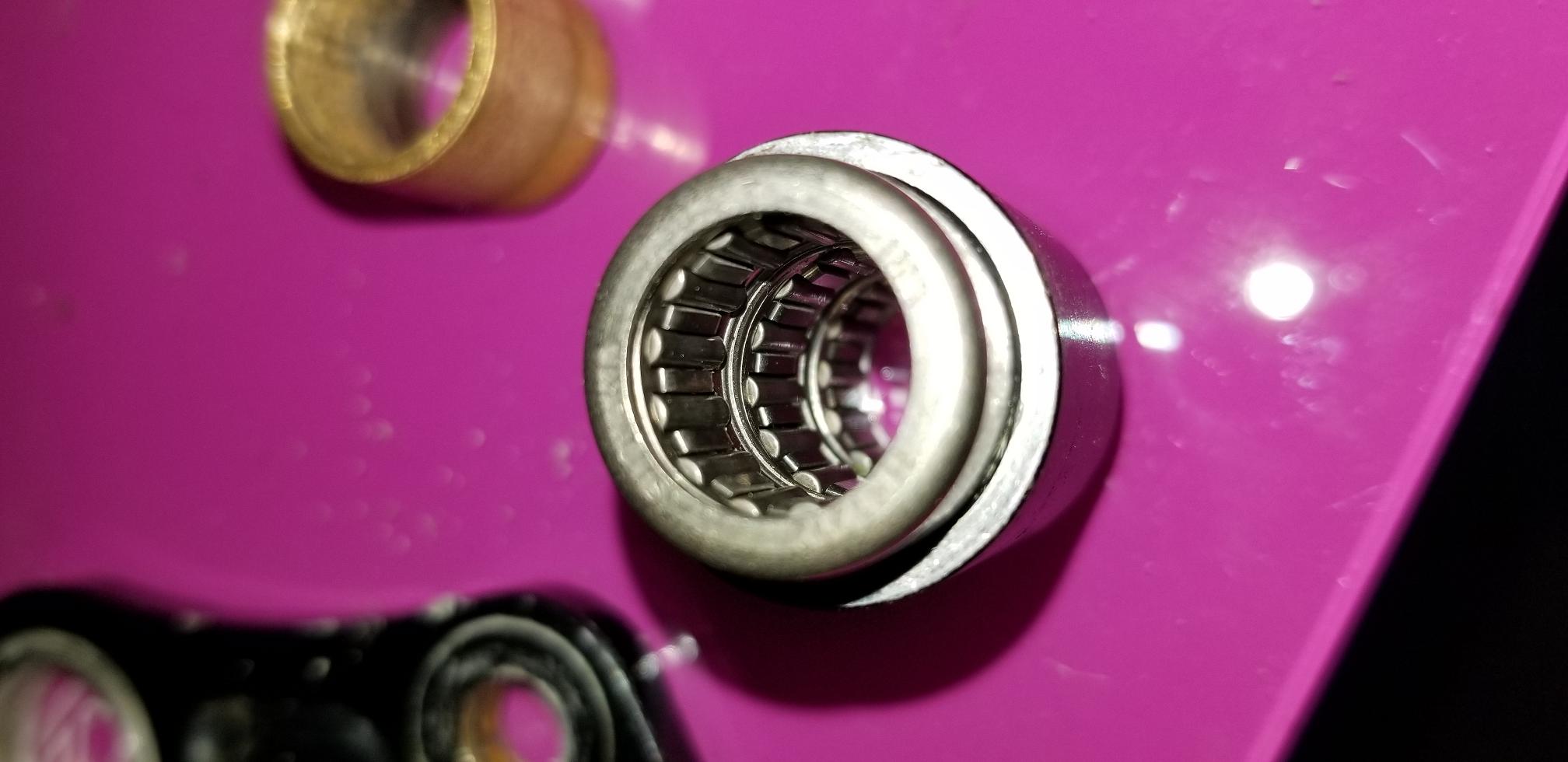 Zawieszenie tylne, temat rzeka, kilka pomyslow mialem juz od dawna, niestety jak jezdzilem to szkoda bylo rozbierac, jak stal, brakowalo czasu, w koncu sie wzialem, na bez przerwy wytlukiwana tulejke wymyslilem dwa wyjscia, pierwsze prostsze, nowe tuleje slizgowe i blokada na sworzniu, poniewaz na nim sie obracala tuleja zamiast miedzy soba, a powoduje to brak mozliwosci scisniecia wszystkiego do kupy, poniewaz zaraz za tym jest potezne wzmocnienie wahacza. Druga trudniejsza, lozyska igielkowe, jako ze sworzen jest z twardej szlifowanej stali moze robic za wewnetrzna tuleje lozyska, a wymiar pozwalal dobrac takowe. Dla sprawdzenia osadzilem dwa i wydawalo mi sie ze jest delikatny luz, jest miejsce na jeszcze jedno to wstawilem w sumie trzy, niestety tuleje slizgowe wstawialem z kolniezem co po scisnieciu dawalo spojna calosc, niestety z lozyskami igelkowymi tak nie jest, musialem krzywki wkleic, w ogolnym rozrachunku i tak skrecone sa amortyzatorem i elementem laczacym z rama, ale musialem jakis to poskladac, stad klej.