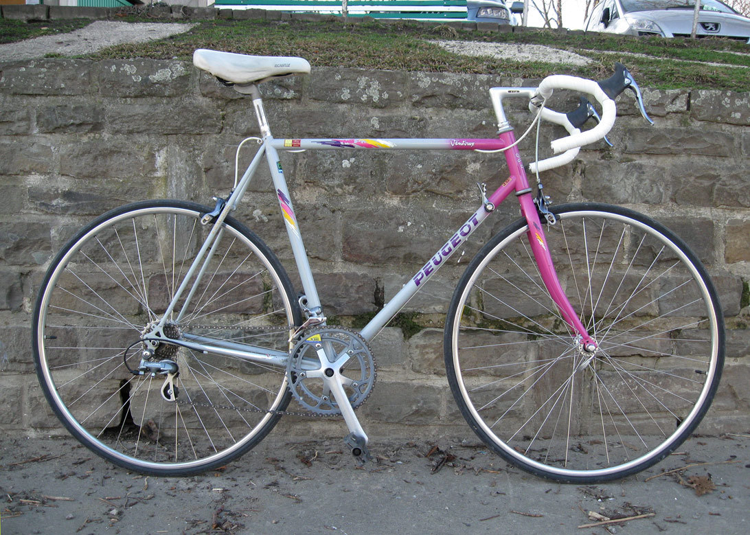 Tym razem zakupiłem szoskę, Peugeot Ventoux z roku 1989. Z tego co wynalazłem w necie to na oryginalnym osprzęcie Shimano Exage EX 500. Wagowo jak na szosę nie zabija, ale te ramy ogólnie zbyt lekkie nie były, a ja jak zwykle kierowałem się wyglądem i stanem roweru. Mój egzemplarz pomimo wieku jest w idealnym stanie, kilka drobnych rys co mnie bardzo cieszy.
