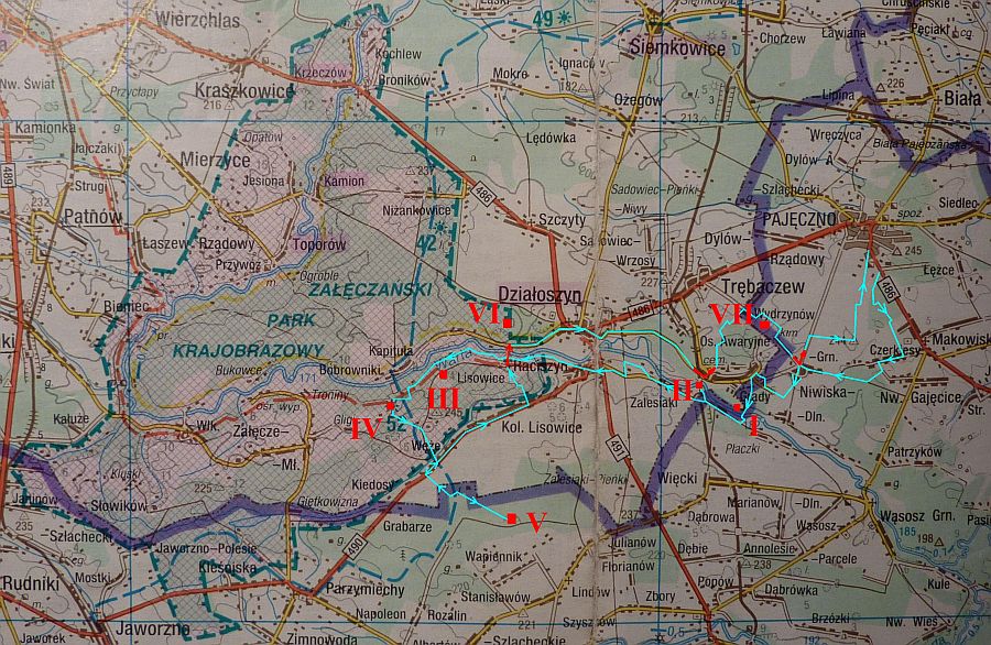 Poniżej mapka - jak widzicie - następnym razem możemy wystartować z Działoszyna lub Bobrownik i zrobić północno - zachodnią część Parku - tam też jeszcze dużo jest do zwiedzania i objeżdżania - stary książęcy kurhan z czasów plemiennych, Toporów, Kamion, Niżankowice, Załęcze, Żabi Staw, Góra Św. Genowefy (najdalej na północ wysunięty w Polsce ostaniec wapienny) i wiele, wiele innych fajnych miejsc.