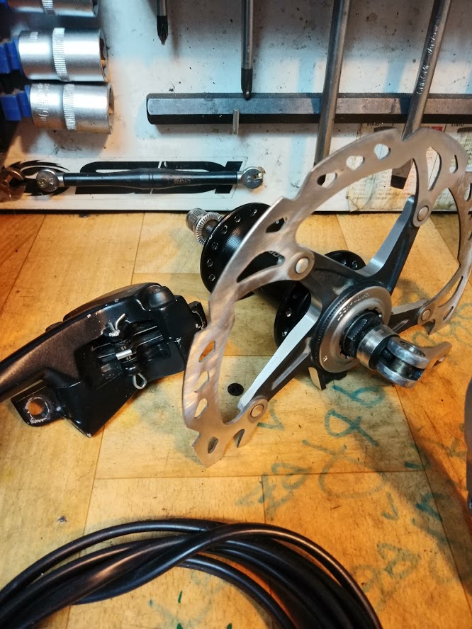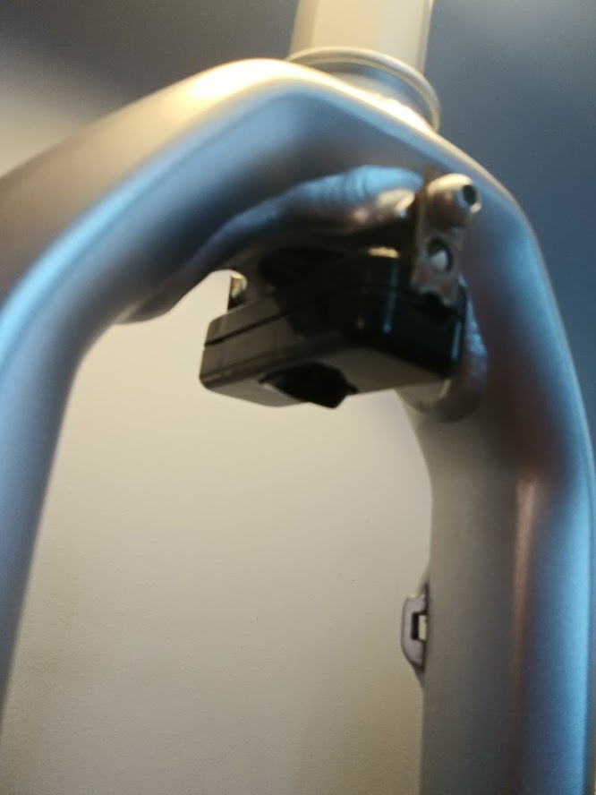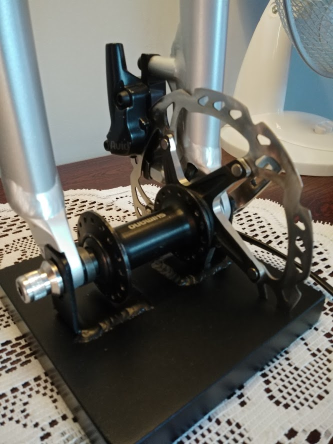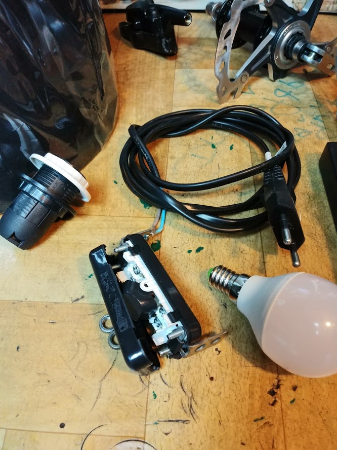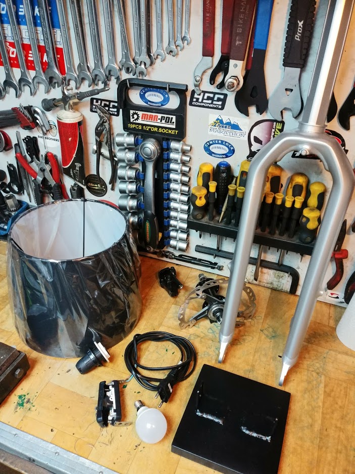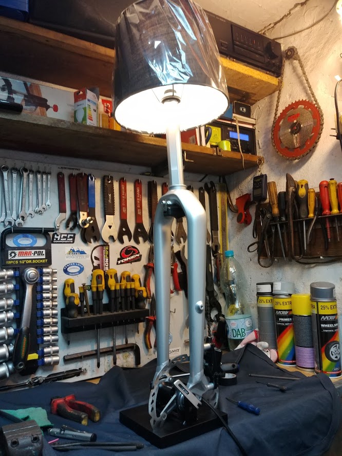 #1Bardzo długo zabierałem się za ten projekt. Z widelca który zakupiłem jako dawca części, bo się bardziej opłacało, zrobiłem lampę biurkową.Jako podstawę wykorzystałem blachę o grubości 20mm i wymiarach 15x15cm. Do blachy przyspawałem uchwyty umożliwiające montaż. całość pomalowałem na czarny mat. Widelec był brązowy, za pomocą środka Troton ściągnąłem lakier i pomalowałem srebrnym metalikiem. A żeby było ciekawiej to znalazłem piastę na centerlock shimano, do niej przykręciłem tarczę xtr która już nie nadawała się do jazdy. Z tyłu zamontowałem zacisk Avida. W lewej goleni poprowadziłem kabel zasilający, którego praktycznie nie widać. Najwięcej kombinacji miałem z wyłącznikiem światła. Zamocowałem go w otwory pod błotnik z obu stron..Oprawkę osadziłem na kleju. Oprawka na gwint E14 idealnie spasowała ze średnicą wewnętrzną widelca.Dokupiłem abażur i zmontowałem wszystko do kupy.Całość wygląda dość ciekawie i jest stabilne.