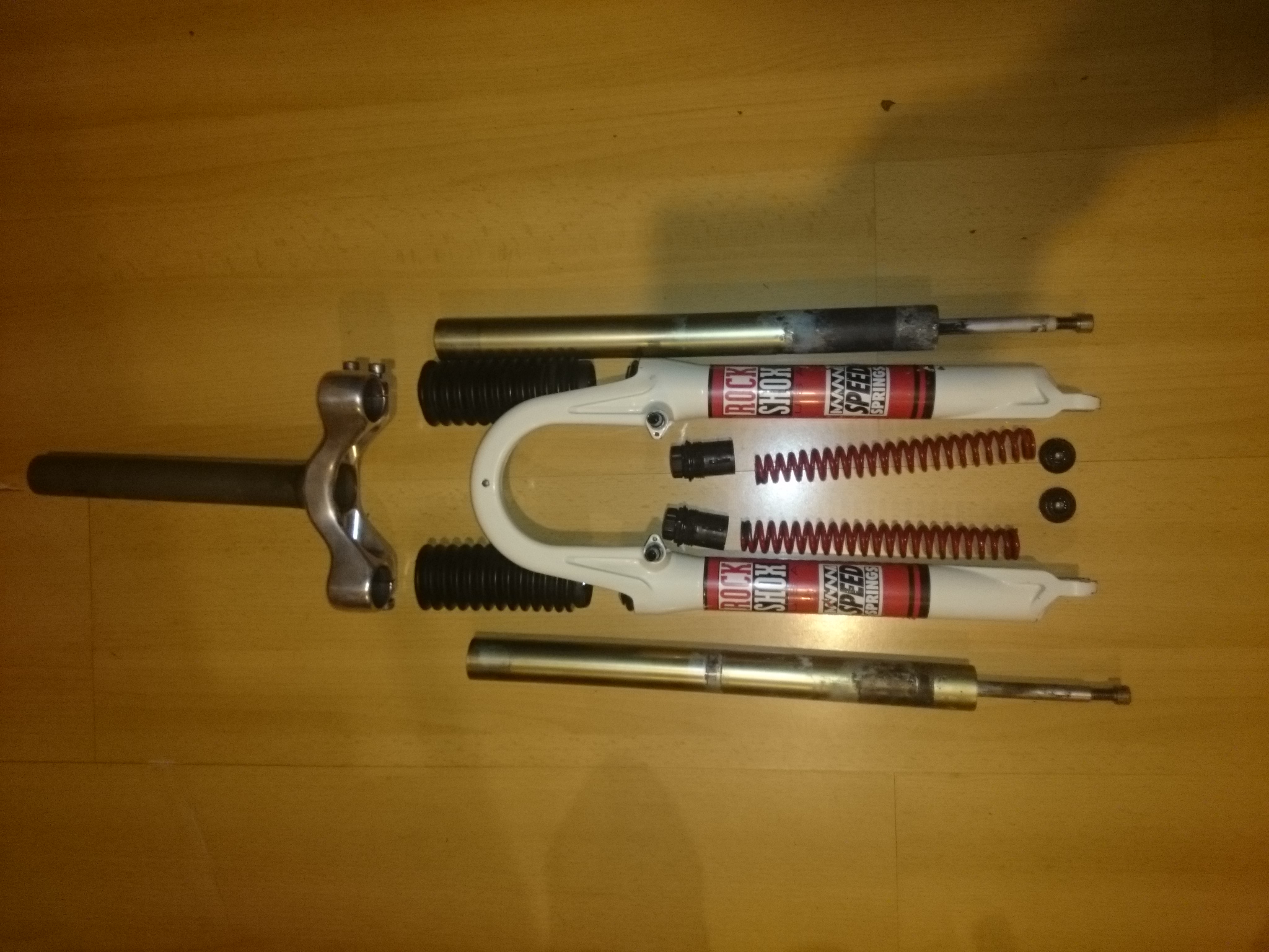 Cześć. Kupiłem dzisiaj taiego RSa, nie ma na naklejkach nigdzie co to za model, ale wygląda jak Judy z 1997. Ale pewności nie mam. Rozebrałem dziada no i wszystko co było jest na fto. Tłumików nie wyjmowałem, bo szczypce do segerów są w garażu. Jeden tłumik ma regulację od spodu, drugi nie. O ile tam wogóle jest jakiś tłumik.