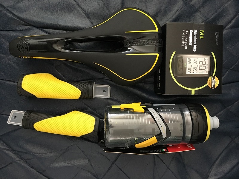 Gostek od którego kupiłem szykował sprzęt dla małolata, z mocnym zacięciem na utrzymanie roweru w tonacji czarno żółtej, co zaowocowało żółtymi linkami hamulców, manetkami i.... oponami.