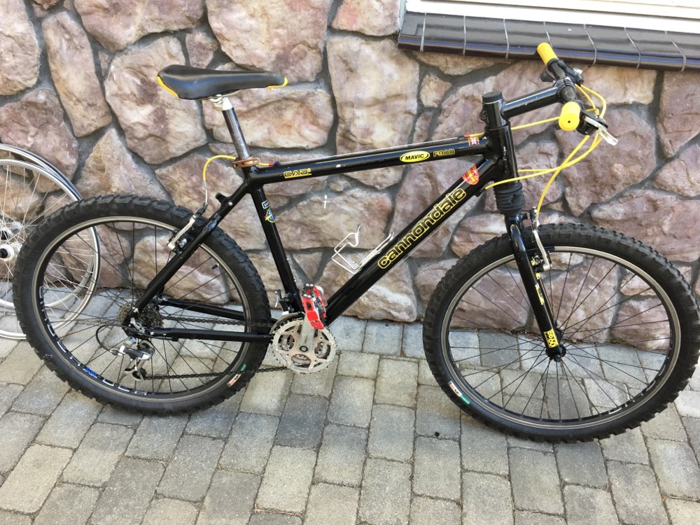 Ponieważ lubię rzeczy nietypowe, więc skusiłem się na zakup trochę zaniedbanego Cannondale F900 z bliżej nie ustalonego rocznika 96-98 (nie bardzo mogę odczytać napisy na ramie). Czarny z żółtymi napisany, parę lat temu ktoś tutaj chwalił się podobnym (F800), na ramie CAAD2. Konfiguracja nie jest 'jak z katalogu', ciężko stwierdzić czy już przy zakupie był dozbrajany, czy też przechodził późniejsze modyfikacje. Osprzęt w większości jest Deore XT, seria M739 (v-brake z równoległym prowadzeniem klocków), więc rocznikowo zgodna z ramą - jest więc możliwe że był tak skonfigurowany od początku. Koła Ritchey PRO (Giroer OCR? - niespecjalnie mogę znaleźć jakieś dodatkowe informacje) ,ale dostałem również oryginalne obręcze Mavic'a z piastami Coda i zajechanymi łożyskami. Przydadzą się jako drugi komplet. Całość uzupełniają pedały Shimano DX M636, platformy z systemem SPD.