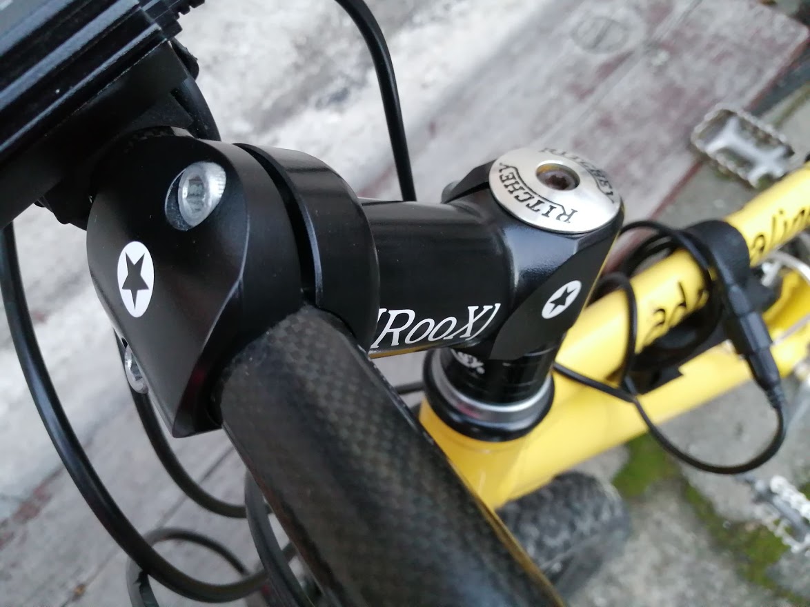 Monika zrobiła kilka przejazdów i stwierdziła że mostek jak dla niej jest za niski. No to musiałem coś z tym zrobić. Z pomocą przyszedł mostek ROOX od Fockera ale był w opłakanym stanie. Postanowiłem mu dać drugie życie... W ruch poszedł Troton, papier ścierny, Podkład dwa razy, czarny mat dwa razy, naklejki( dzięki Done) i na końcu dwa razy bezbarwny. Wyszło ok choć powłoka nie ma takiej trwałości jak bym oczekiwał to mostek spełnia oczekiwania. Dziękuję również za pomoc Jacques_de_Molay w naklejkach na ramę, na razie nie mam czasu iść do poligrafii ale na pewno to zrobię :)