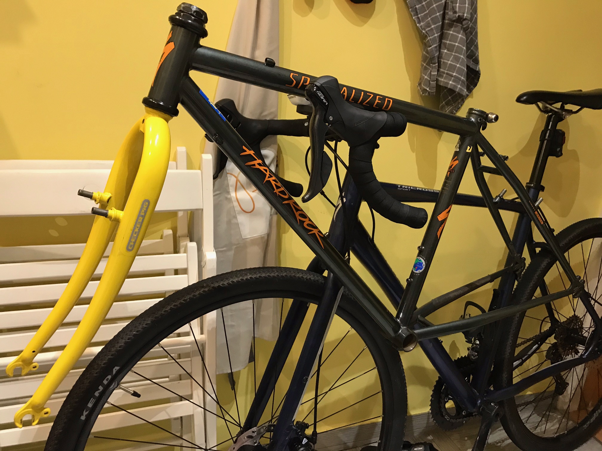 Cześć, wszedłem w posiadanie framesetu speca, jak łatwo się domyślić chciałbym zrobić sobie z niego „retro MTB”. Niestety mam zagwozdkę, bo wyszukałem, że seryjnie wychodził on z amortyzowanym widelcem i zastanawiam się czy z załączonym na obrazku widelcem również cro-mo będzie współdziałał? Jestem ciekaw również, czy wersje sztywne mają taką samą geometrię ramy.