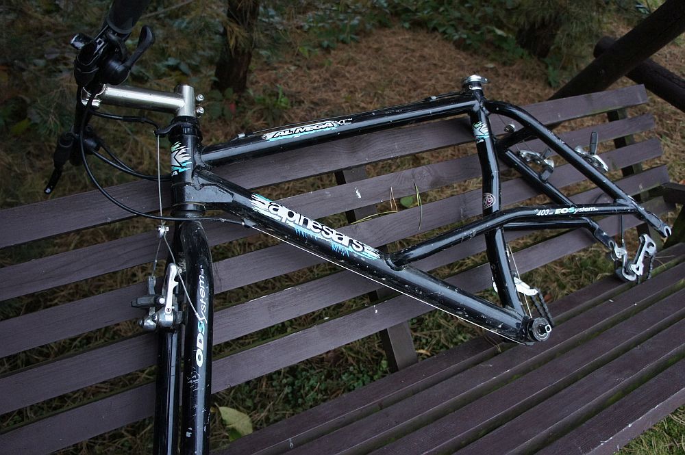 Tu seryjny Alpinestars Almega XT katalogowo dostępny na rok 92 z mostkiem ahead własnej produkcji. Celowo pisze mostkiem gdyż całość była w systemie łączonym (rura w części gwintowana, wyżej gładka o średnicy nietypowej dla żadnego z późniejszych systemów ahead)