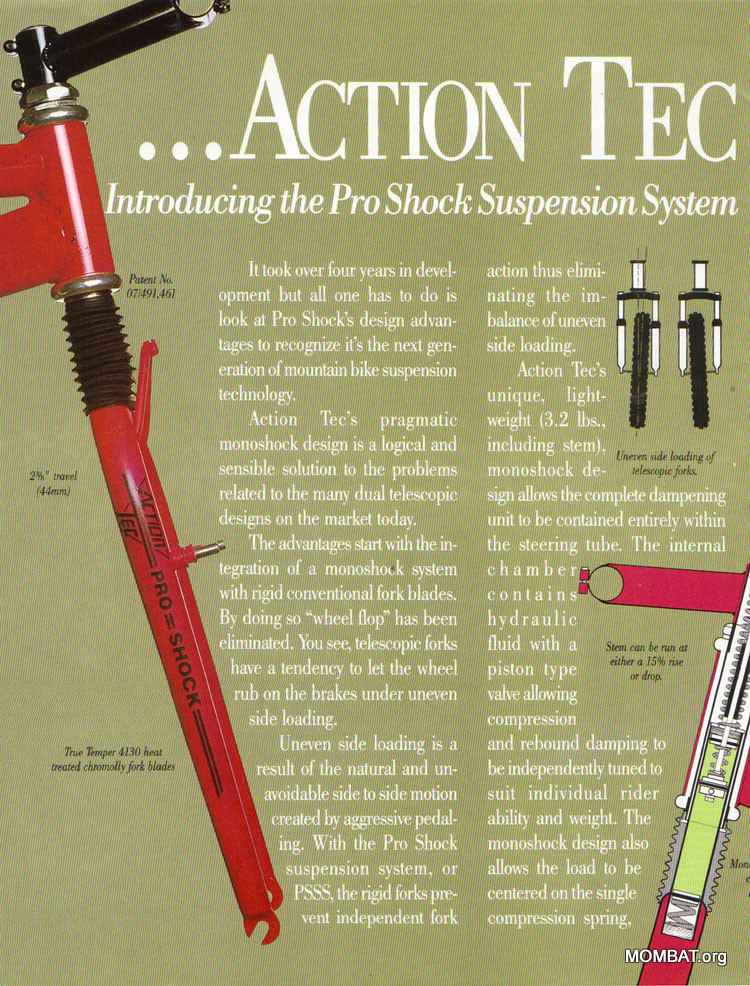 A jeśli chodzi o inne konstrukcje analogiczne do HS DeltaV/DD/Fatty/P-Phone, to pierwsza na tym polu była firma Action Tec. Amortyzator z 1991r (pierwszy Cannondale i jego pierwszy widelec Delta-V- 1992) bardzo zaawansowany technologicznie - sprężyna negatywna i specjalna sprężyna reagująca na zwiększanie się objętości oleju pod wpływem temperatury w czasie pracy amora (bolączka cartridge'y w RS). Możliwość szybkiej regulacji tłumienia (a może nawet zablokowania) w locie. Wchodził na rurę 1 1/8". Zwróćcie uwagę na jedną rzecz - mocowanie w rurze sterowej jakby na raz gwint i AHead. Ciekawe.